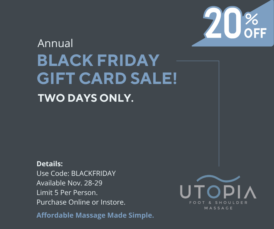 Looking for the best Black Friday spa deal in Atlanta or Smyrna? Your search ends here. Utopia Foot & Shoulder Massage is celebrating the season of giving with our Annual Black Friday Gift Card Sale — and it’s our biggest savings event of the year!