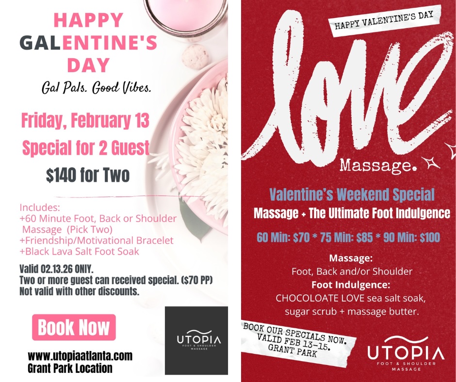 At Utopia Foot & Shoulder Massage Grant Park, we believe love comes in many forms: romantic, platonic, and self-love included. This February, we’re inviting you to celebrate Valentine’s Day Weekend and Galentine’s Day in Grant Park with affordable, feel-good massage experiences designed to help you slow down and reset.